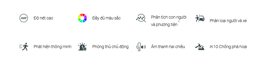 | Sự kiện thông minh | • Intrusion Detection • Line-Crossing Detection • Region Entering Detection • Region Exiting Detection • Object Abandoned Detection • Object Removal Detection • Loitering Detection • People Detection • Vehicle Detection • Abnormal Sound Detection • Scene Change Detection |